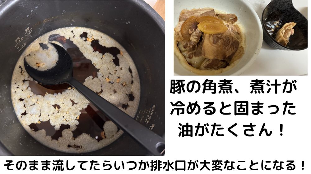 例えば、冷えると固まる油!豚の角煮の煮汁、ドロドロのカレー鍋、ハンバーグや餃子を作った後のボウルのベトベトは食器洗剤でエイヤーっと洗ってそのままシンクに流していました😆