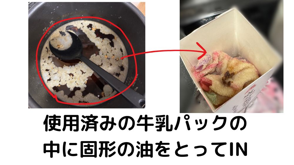 - 冷めると固まる油は特に注意!冷まして固形になってからヘラなどを使ってゴミへ捨てる