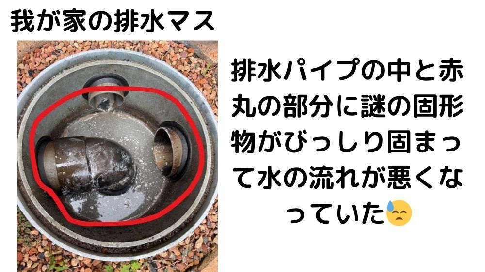 原因は、排水パイプと排水マスに溜まった固形物が排水の通る部分を塞いでしまったことでした!