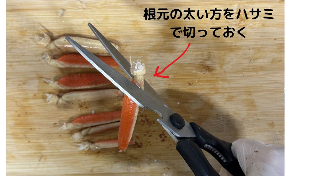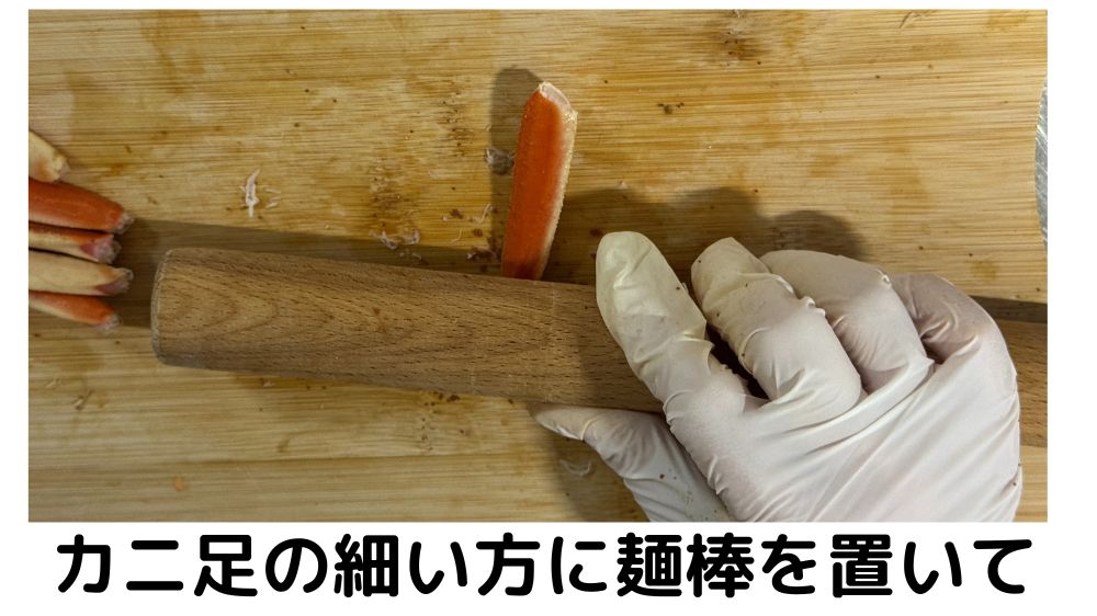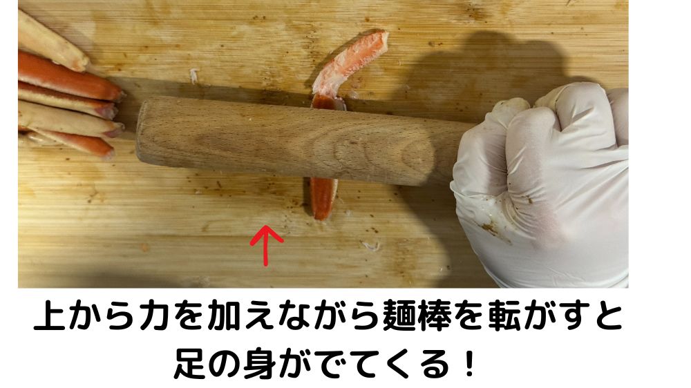 今回は 麺棒を使って、カニ足の身をスルッとむく方法 を
