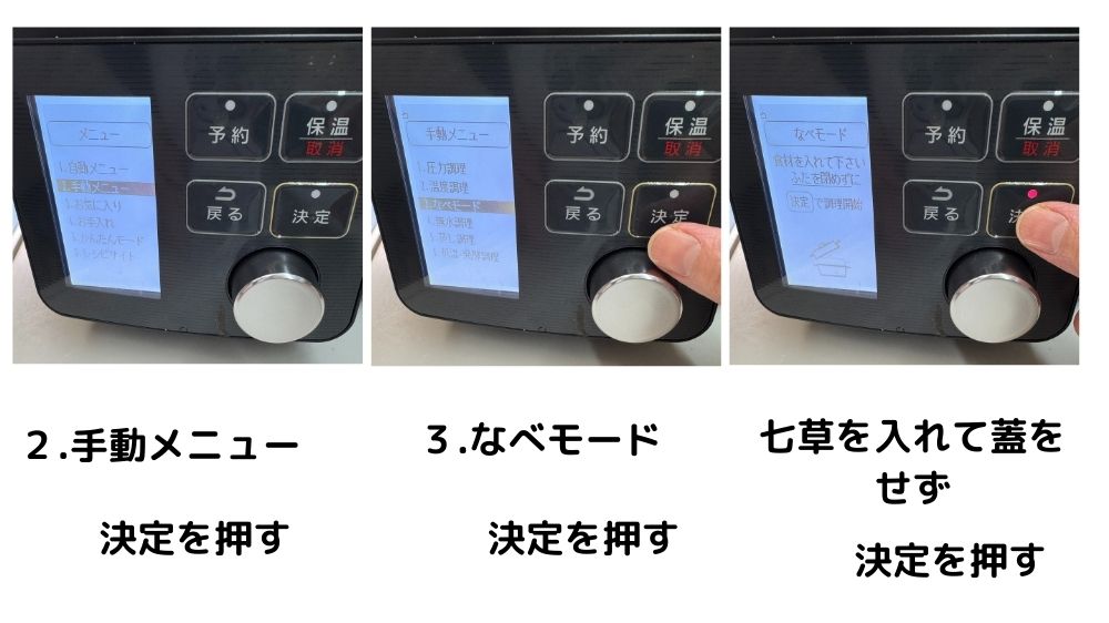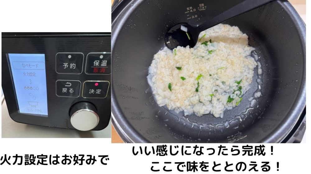 **手動の「なべモード」**で下茹でした七草を加え、少し煮込みます。
