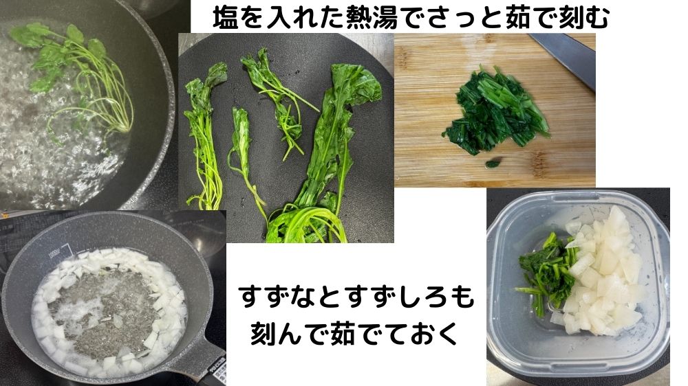 鍋に湯を沸かし、少量の塩を入れて七草の葉物はさっと下茹で。