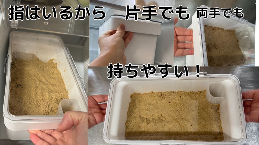 ⑥持ち手付きで冷蔵庫からの出し入れがラク