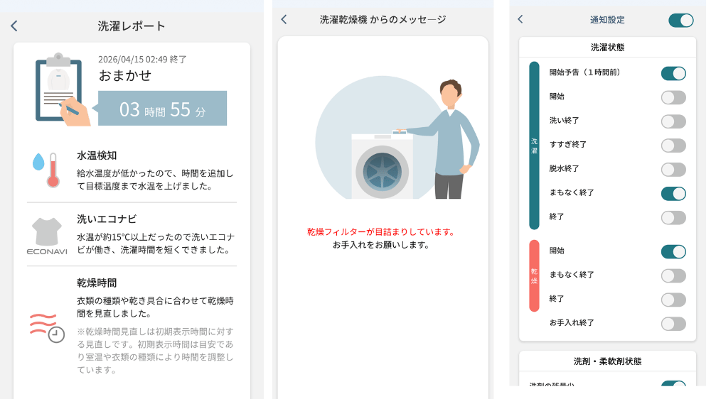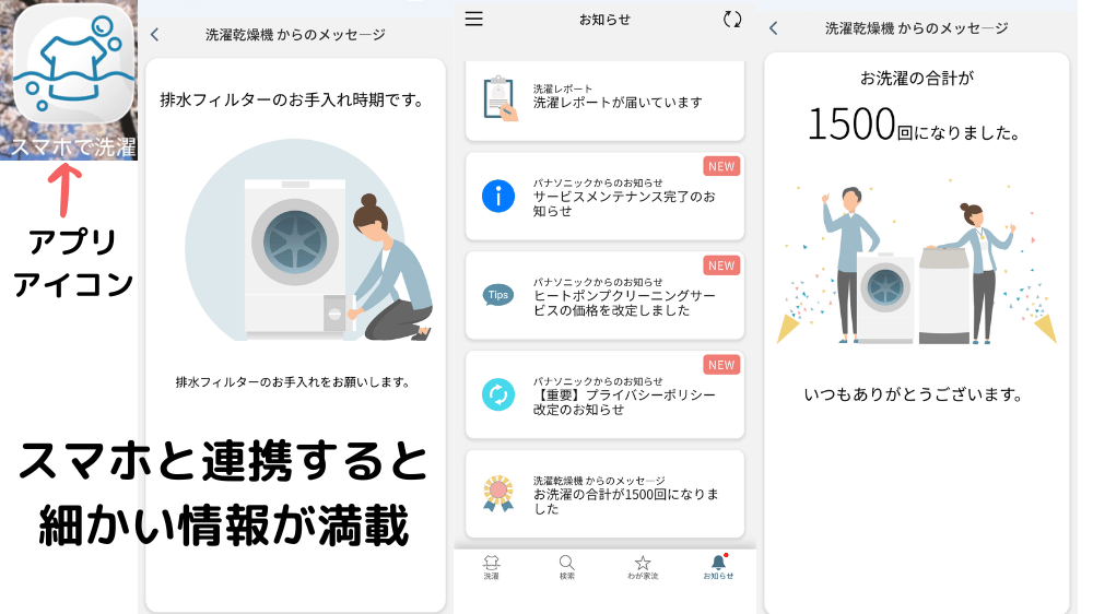 「スマホで洗濯」アプリを使えば、外出先から洗濯スタート・終了通知の受け取りも可能。仕事から帰る時間に合わせて洗濯を終わらせる、なんてことも簡単にできます👍