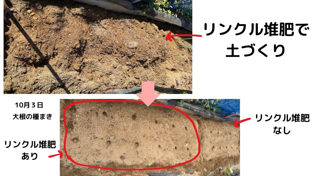 ◆ 10月3日:リンクル堆肥あり・なしで大根の種を同時に蒔きました