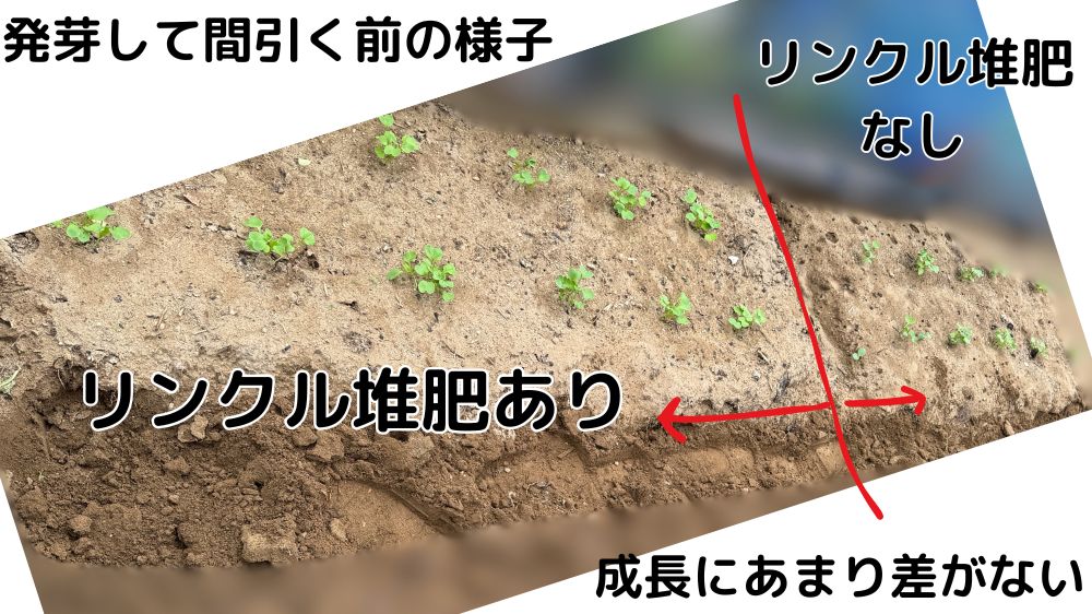 実験のような気持ちで、リンクル堆肥ありの畝と、なしの畝に、それぞれ5〜6粒ずつ同じ品種の大根の種をまき、その後は同様に管理しました。